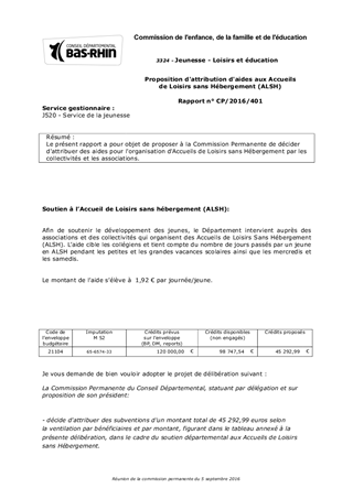 Le présent rapport a pour objet de proposer à la Commission Permanente de décider d'attribuer des aides pour l'organisation d'Accueils de Loisirs sans Hébergement par les collectivités et les associations.