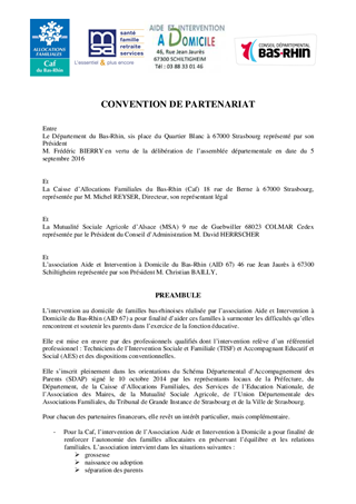 Proposition d'approbation du projet de convention de partenariat à conclure entre le Département du Bas-Rhin, la Caisse d’Allocations Familiales, la Mutualité Sociale Agricole et l’Association Aide et Intervention à Domicile relative aux mesures d’intervention à domicile des techniciens de l'intervention sociale et familiale (TISF) et des Accompagnants Educatifs et Sociaux (AES).