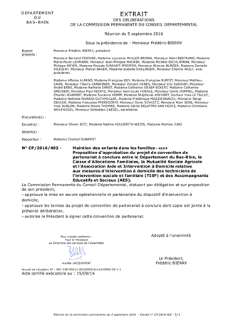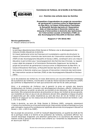 La politique départementale d'Aide Sociale à l'Enfance vise le développement des mesures d'aides éducatives à domicile. Un travail partenarial entre les financeurs et le prestataire a permis de structurer la mesure d’intervention à domicile des techniciens de l'intervention sociale et familiale (TISF) et des Accompagnants Educatifs et Sociaux (AES), constituant ainsi une mesure éducative à part entière pour l'accompagnement des familles bas-rhinoises. Le rapport a pour objet de proposer à la Commission Permanente d'approuver les termes du projet de convention de partenariat à conclure entre le Département du Bas-Rhin, la Caisse d’Allocations Familiales, la Mutualité Sociale Agricole et l’Association Aide et Intervention à Domicile relative aux mesures d’intervention à domicile des techniciens de l'intervention sociale et familiale (TISF) et des Accompagnants Educatifs et Sociaux (AES).