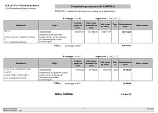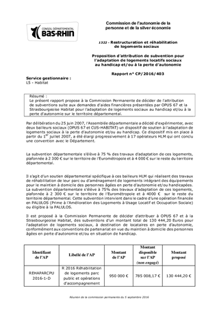 Le présent rapport propose à la Commission Permanente de décider de l'attribution de subventions suite aux demandes d'aides financières présentées par OPUS 67 et la Strasbourgeoise Habitat pour l'adaptation de logements sociaux au handicap et/ou à la perte d'autonomie sur le territoire départemental.