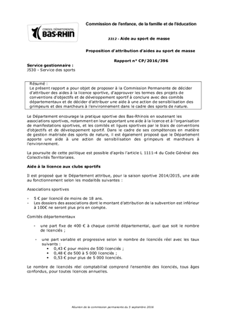 Le présent rapport a pour objet de proposer à la Commission Permanente de décider d'attribuer des aides à la licence sportive, d'approuver les termes des projets de conventions d’objectifs et de développement sportif à conclure avec des comités départementaux et de décider d'attribuer une aide à une action de sensibilisation des grimpeurs et des marcheurs à l'environnement dans le cadre des sports de nature.