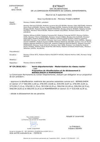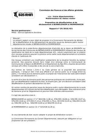 Le présent rapport a pour objet de proposer à la Commission Permanente de décider de la désaffectation et du déclassement de parcelles issues du domaine public routier départemental situées à BERNOLSHEIM et MOMMENHEIM.