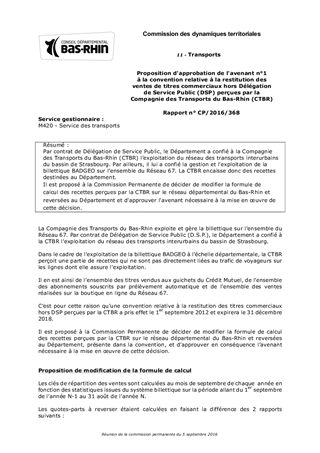 Par contrat de Délégation de Service Public, le Département a confié à la Compagnie des Transports du Bas-Rhin (CTBR) l’exploitation du réseau des transports interurbains du bassin de Strasbourg. Par ailleurs, il lui a confié la gestion et l'exploitation de la billettique BADGEO sur l’ensemble du Réseau 67. La CTBR encaisse donc des recettes destinées au Département. Il est proposé à la Commission Permanente de décider de modifier la formule de calcul des recettes perçues par la CTBR sur le réseau départemental du Bas-Rhin et reversées au Département et d'approuver l'avenant nécessaire à la mise en œuvre de cette décision.