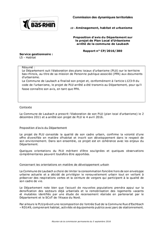 Le Département suit l’élaboration des plans locaux d’urbanisme (PLU) sur le territoire bas-rhinois, au titre de sa mission de Personne publique associée (PPA) aux documents d’urbanisme. La Commune de Laubach a finalisé son projet et, conformément à l'article L123-9 du code de l’urbanisme, le projet de PLU arrêté a été transmis au Département, pour qu’il fasse connaître son avis, en tant que PPA.