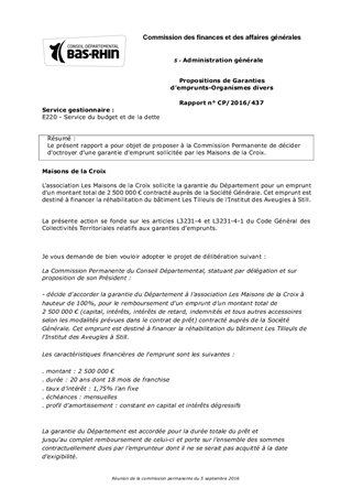 Le présent rapport a pour objet de proposer à la Commission Permanente de décider d'octroyer d’une garantie d’emprunt sollicitée par les Maisons de la Croix.