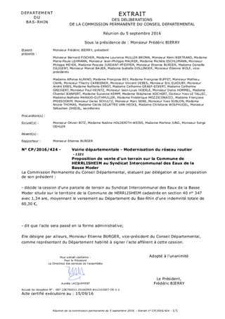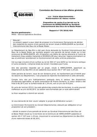 Le présent rapport a pour objet de proposer à la Commission Permanente de décider des modalités de cession d'une parcelle de terrain située à HERRLISHEIM au Syndicat Intercommunal des Eaux de la Basse Moder.