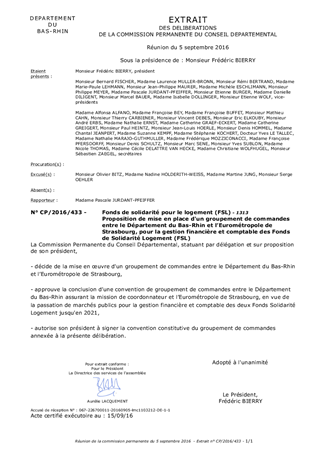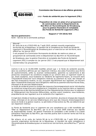 Proposition de mise en place d'un groupement de commandes entre le Département du Bas-Rhin et l’Eurométropole de Strasbourg, pour la gestion financière et comptable des Fonds de Solidarité Logement (FSL)