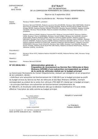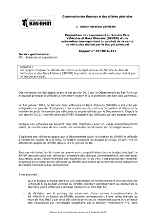 Ce rapport propose de décider de rendre au budget annexe du Service du Parc de Véhicules et des Bacs Rhénans (SPVBR) le produit de la vente des véhicules réalisé par le budget principal.