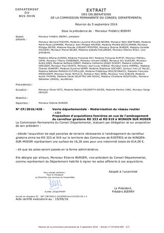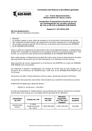 Le présent rapport a pour objet de proposer à la Commission Permanente de décider des modalités d'indemnisation des acquisitions foncières nécessaires à l'aménagement du carrefour giratoire des RD 333 et 919 sur le territoire des Communes de ROSTEIG et de WINGEN-SUR-MODER.