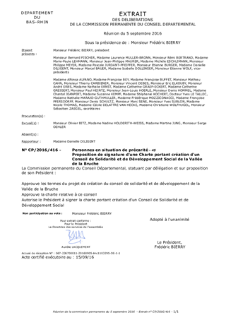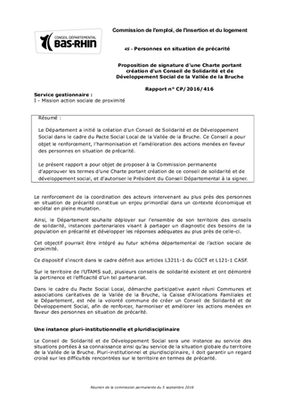 Le Département a initié la création d’un Conseil de Solidarité et de Développement Social dans le cadre du Pacte Social Local de la Vallée de la Bruche. Ce Conseil a pour objet le renforcement, l’harmonisation et l’amélioration des actions menées en faveur des personnes en situation de précarité. Le présent rapport a pour objet de proposer à la Commission permanente d’approuver les termes d’une Charte portant création de ce conseil de solidarité et de développement social, et d’autoriser le Président du Conseil Départemental à la signer.