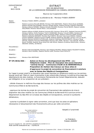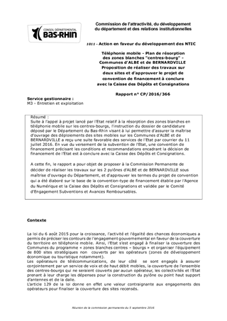 Suite à l’appel à projet lancé par l'Etat relatif à la résorption des zones blanches en téléphonie mobile sur les centres-bourgs, l'instruction du dossier de candidature déposé par le Département du Bas-Rhin visant à lui permettre d’assurer la maîtrise d’ouvrage des déploiements des sites mobiles sur les Communes d’ALBE et de BERNARDVILLE a reçu une suite favorable des services de l'Etat par courrier du 11 juillet 2016. En vue du versement de la subvention de l’Etat, une convention de financement précisant les conditions et recommandations encadrant la décision de financement de l’Etat est à conclure avec la Caisse des Dépôts et Consignations. A cette fin, le rapport a pour objet de proposer à la Commission Permanente de décider de réaliser les travaux sur les 2 pylônes d'ALBE et de BERNARDVILLE sous maîtrise d'ouvrage du Département, et d'approuver les termes du projet de convention qui a été élaboré sur le base de la convention-type de financement établie par l’Agence du Numérique et la Caisse des Dépôts et Consignations et validée par le Comité d’Engagement Subventions et Avances Remboursables.