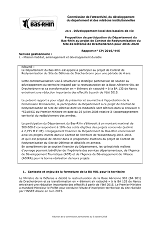Proposition de participation du Département du Bas-Rhin au projet de Contrat de Redynamisation du Site de Défense de Drachenbronn pour 2016-2020