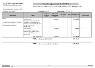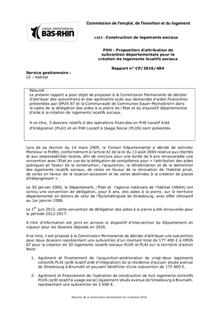 Le présent rapport a pour objet de proposer à la Commission Permanente de décider d’attribuer des subventions et des agréments suite aux demandes d’aides financières présentées par OPUS 67 et la Communauté de Communes Sauer-Pechelbronn dans le cadre de la délégation des aides à la pierre de l’Etat et du dispositif départemental d’aide à la création de logements locatifs sociaux. A ce titre, 3 dossiers relatifs à des opérations financées en Prêt Locatif Aidé d’Intégration (PLAI) et en Prêt Locatif à Usage Social (PLUS) sont présentés.