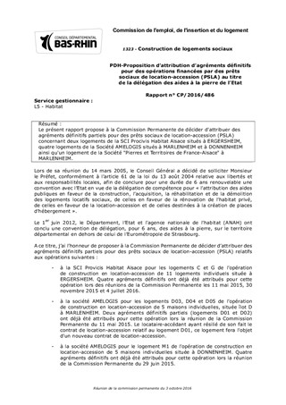 Le présent rapport propose à la Commission Permanente de décider d'attribuer des agréments définitifs partiels pour des prêts sociaux de location-accession (PSLA) concernant deux logements de la SCI Procivis Habitat Alsace situés à ERGERSHEIM, quatre logements de la Société AMELOGIS situés à MARLENHEIM et à DONNENHEIM ainsi qu'un logement de la Société "Pierres et Territoires de France-Alsace" à MARLENHEIM.