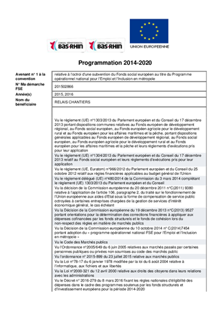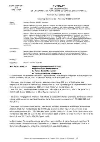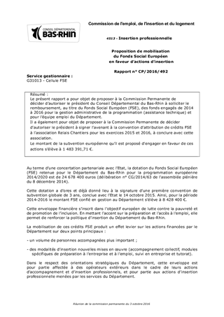 Le présent rapport a pour objet de proposer à la Commission Permanente de décider d’autoriser le président du Conseil Départemental du Bas-Rhin à solliciter le remboursement, au titre du Fonds Social Européen (FSE), des fonds engagés de 2014 à 2016 pour la gestion administrative de la programmation (assistance technique) et pour l’équipe emploi du Département. Il a également pour objet de proposer à la Commission Permanente de décider d'autoriser le président à signer l’avenant à la convention d’attribution de crédits FSE à l’association Relais Chantiers pour les exercices 2015 et 2016, à conclure avec cette association. Le montant de la subvention européenne qu’il est proposé d'engager en faveur de ces actions s’élève à 1 483 391,71 €.