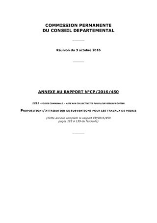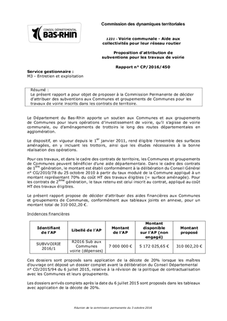 Le présent rapport a pour objet de proposer à la Commission Permanente de décider d’attribuer des subventions aux Communes et groupements de Communes pour les travaux de voirie inscrits dans les contrats de territoire.
