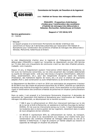 Le rapport propose à la Commission Permanente de décider d'attribuer des subventions en faveur de 4 demandes présentées par l'association AVA Habitat et Nomadisme pour l'amélioration des conditions d'habitat de ménages très défavorisés à Sélestat, Mertzwiller, Kaltenhouse et Erstein.