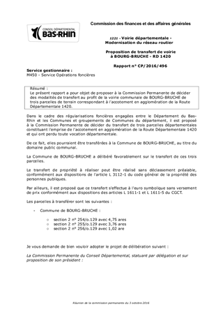 Le présent rapport a pour objet de proposer à la Commission Permanente de décider des modalités de transfert au profit de la voirie communale de BOURG-BRUCHE de trois parcelles de terrain correspondant à l'accotement en agglomération de la Route Départementale 1420.