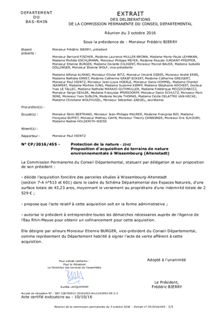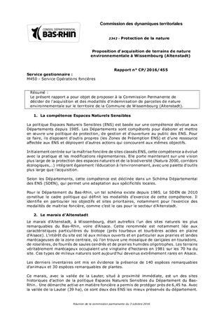 Le présent rapport a pour objet de proposer à la Commission Permanente de décider de l'acquisition et des modalités d’indemnisation de parcelles de nature environnementale sur le territoire de la Commune de Wissembourg (Altenstadt).