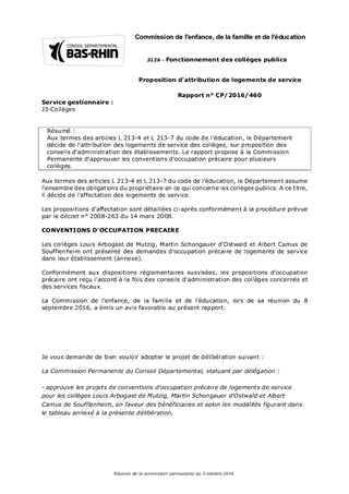 Aux termes des articles L 213-4 et L 213-7 du code de l’éducation, le Département décide de l’attribution des logements de service des collèges, sur proposition des conseils d’administration des établissements. Le rapport propose à la Commission Permanente d'approuver les conventions d'occupation précaire pour plusieurs collèges.