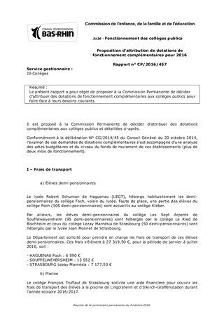Le présent rapport a pour objet de proposer à la Commission Permanente de décider d'attribuer des dotations de fonctionnement complémentaires aux collèges publics pour faire face à leurs besoins courants.
