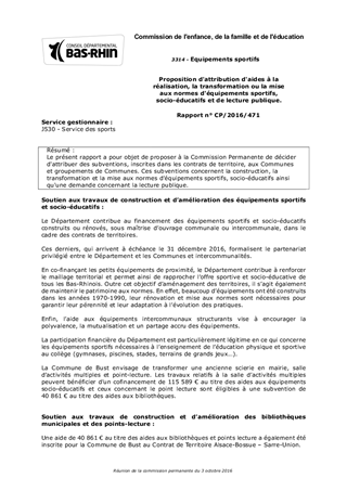 Le présent rapport a pour objet de proposer à la Commission Permanente de décider d'attribuer des subventions, inscrites dans les contrats de territoire, aux Communes et groupements de Communes. Ces subventions concernent la construction, la transformation et la mise aux normes d’équipements sportifs, socio-éducatifs ainsi qu'une demande concernant la lecture publique.