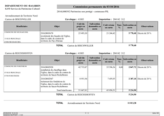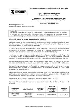 Le présent rapport a pour objet de proposer à la Commission Permanente de décider d'attribuer des subventions aux Communes, pour le financement de travaux en faveur du patrimoine religieux, dans le cadre des contrats de territoires en vigueur.