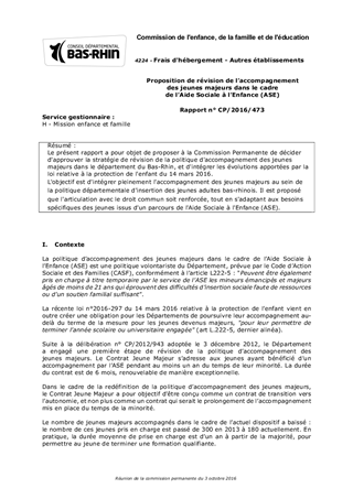 Le présent rapport a pour objet de proposer à la Commission Permanente de décider d'approuver la stratégie de révision de la politique d'accompagnement des jeunes majeurs dans le département du Bas-Rhin, et d'intégrer les évolutions apportées par la loi relative à la protection de l'enfant du 14 mars 2016. L'objectif est d'intégrer pleinement l'accompagnement des jeunes majeurs au sein de la politique départementale d'insertion des jeunes adultes bas-rhinois. Il est proposé que l'articulation avec le droit commun soit renforcée, tout en s'adaptant aux besoins spécifiques des jeunes issus d'un parcours de l'Aide Sociale à l'Enfance (ASE).