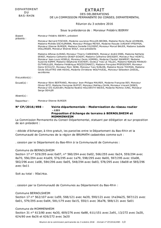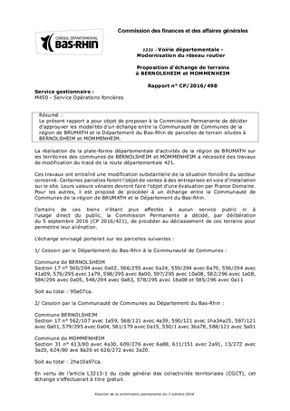 Le présent rapport a pour objet de proposer à la Commission Permanente de décider d'approuver les modalités d’un échange entre la Communauté de Communes de la région de BRUMATH et le Département du Bas-Rhin de parcelles de terrain situées à BERNOLSHEIM et MOMMENHEIM.