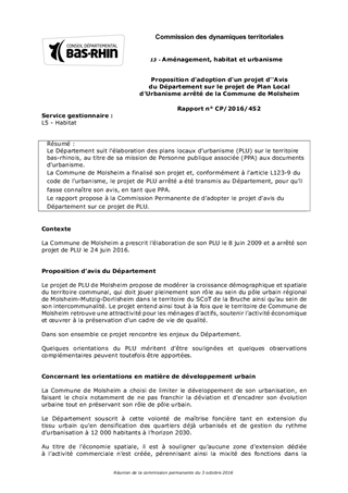 Le Département suit l’élaboration des plans locaux d’urbanisme (PLU) sur le territoire bas-rhinois, au titre de sa mission de Personne publique associée (PPA) aux documents d’urbanisme. La Commune de Molsheim a finalisé son projet et, conformément à l'article L123-9 du code de l’urbanisme, le projet de PLU arrêté a été transmis au Département, pour qu’il fasse connaître son avis, en tant que PPA. Le rapport propose à la Commission Permanente de d'adopter le projet d'avis du Département sur ce projet de PLU.