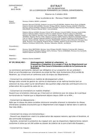 Proposition d'adoption d'un projet d''Avis du Département sur le projet de Plan Local d'Urbanisme arrêté de la Commune de Molsheim