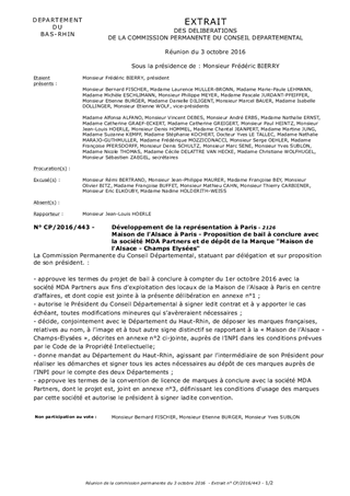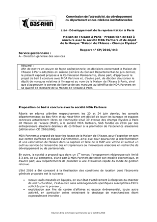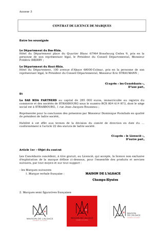Afin de mettre en œuvre de façon opérationnelle les décisions concernant la Maison de l'Alsace à Paris adoptées en séance plénière du Conseil Départemental de juin dernier, le présent rapport propose à la Commission Permanente, d’une part, d'approuver le projet de bail à conclure avec MDA Partners et, d’autre part, de décider d’autoriser le dépôt de marques relatives à l’image et au nom de la Maison de l’Alsace à Paris, ainsi que d'approuver le contrat de licence de ces marques au bénéfice de MDA Partners en sa qualité de locataire de la Maison de l’Alsace à Paris.