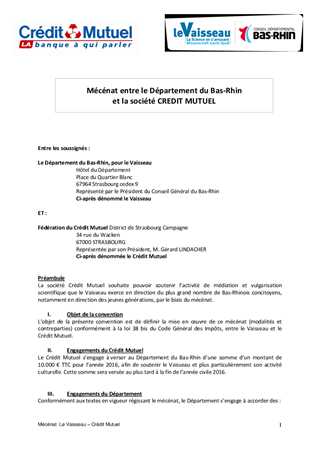 Le présent rapport a pour objet de proposer à la Commission Permanente de décider d'approuver les termes d'un projet de convention de mécénat à conclure entre le Département du Bas-Rhin et le Crédit Mutuel district Strasbourg Campagne, pour accompagner en 2016 le Vaisseau dans ses missions de diffusion de la culture scientifique.