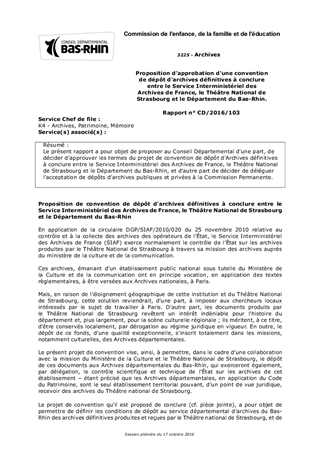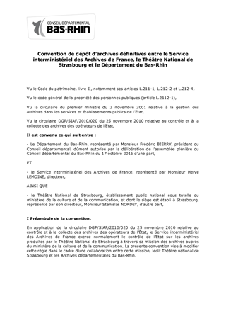 Le présent rapport a pour objet de proposer au Conseil Départemental d'une part, de décider d'approuver les termes du projet de convention de dépôt d'Archives définitives à conclure entre le Service Interministériel des Archives de France, le Théâtre National de Strasbourg et le Département du Bas-Rhin, et d'autre part de décider de déléguer l'acceptation de dépôts d'archives publiques et privées à la Commission Permanente.