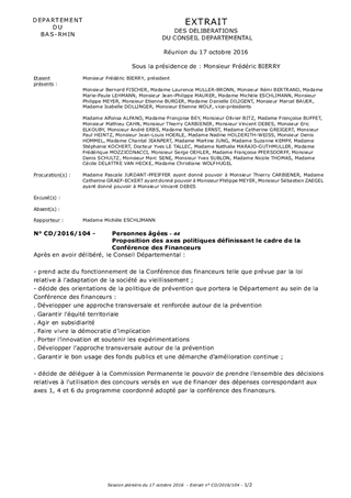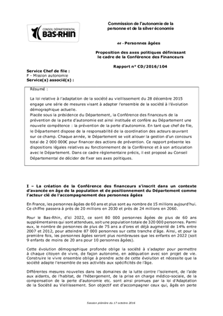 La loi relative à l’adaptation de la société au vieillissement du 28 décembre 2015 engage une série de mesures visant à adapter l’ensemble de la société à l’évolution démographique actuelle. Placée sous la présidence du Département, la Conférence des financeurs de la prévention de la perte d’autonomie est ainsi instituée et confère au Département une nouvelle compétence : la prévention de la perte d’autonomie. En tant que chef de file, le Département dispose de la responsabilité de la coordination des acteurs œuvrant sur ce champ. Chaque année, le Département se voit allouer la gestion d’un concours total de 2 000 000€ pour financer des actions de prévention. Ce rapport présente les dispositions légales relatives au fonctionnement de la Conférence et à son articulation avec le Département. Dans ce cadre règlementaire précis, il est proposé au Conseil Départemental de décider de fixer ses axes politiques.
