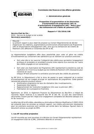 Le présent rapport a pour objet de proposer au Conseil Départemental de décider d'approuver les créations, augmentations et diminutions d'Autorisations de Programme (AP) et d'Autorisations d'Engagement (AE), ainsi que les échéanciers de Crédits de Paiement (CP) afférents à l'ensemble des AP et AE.