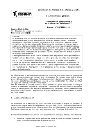 La « Fabrique 67 » est un appel à projets proposé par le Président aux agents du Département pour innover au quotidien à partir des idées de terrain : simplifier l’organisation, améliorer la qualité du service et de la relation aux usagers, rendre un meilleur service au meilleur coût. Cette démarche constitue une mise en œuvre pragmatique de la démocratie d’implication et d’engagement au sein des services du Département et s’inscrit dans le cadre de la démarche bien-être au travail. L’objectif de la « Fabrique 67 » est de recueillir les suggestions des agents du Département, de consolider celles retenues dans le cadre de l'appel à projets pour les mettre en œuvre de manière opérationnelle. L’intelligence collective et les savoirs du terrain sont de précieux atouts pour repenser l'action publique de demain. « Seuls nous allons plus vite, ensemble nous allons plus loin » : c’est cette ambition d’améliorer collectivement le service rendu aux Bas-Rhinois qui a guidé les participants de « La Fabrique 67 » dans leurs propositions. Le présent rapport a pour objet de proposer au Conseil Départemental de prendre acte des résultats de la « Fabrique 67 » et de décider de la mise en œuvre des propositions issues de la démarche.