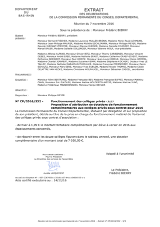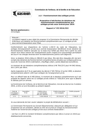 Proposition d'attribution de dotations de fonctionnement complémentaires aux collèges privés sous contrat pour 2016