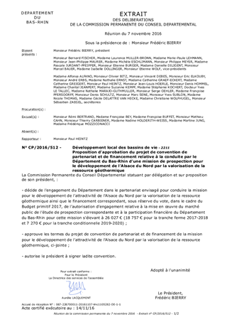 La Commission Permanente du Conseil Départemental réunie le 5 septembre 2016 a décidé que le Département du Bas-Rhin assurera la maîtrise d’ouvrage d’une mission de prospection pour le développement de l’Alsace du Nord par la valorisation de la ressource géothermique et sollicitera des soutiens financiers auprès de ses partenaires dans le cadre du cofinancement de cette opération. Le présent rapport a pour objet de proposer à la Commission Permanente de décider, d’une part, du partenariat et du financement relatif à cette mission de prospection et, d’autre part, d'approuver les termes du projet de convention à conclure entre le Département du Bas-Rhin et les partenaires concernés.