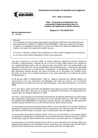 Il est proposé à la Commission Permanente de décider d’attribuer des subventions et des agréments à l'OPUS 67, DOMIAL ESH, BATIGERE, le Nouveau Logis de l’Est dans le cadre de la délégation des aides à la pierre de l’Etat et du dispositif départemental d’aide à la création de logements locatifs sociaux. A ce titre, 8 dossiers relatifs à des opérations en Prêt Locatif à Usage Social (PLUS) et/ou en Prêt Locatif Aidé d’Intégration (PLAI) sont présentés.