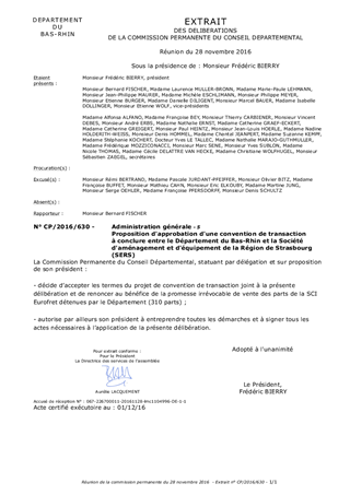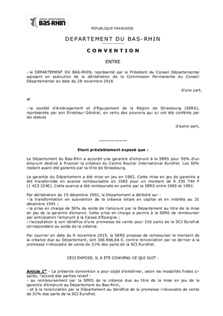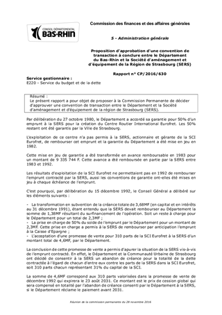 Le présent rapport a pour objet de proposer à la Commission Permanente de décider d'approuver une convention de transaction entre le Département et la Société d’aménagement et d’équipement de la région de Strasbourg (SERS).