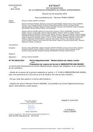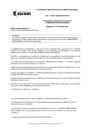Le présent rapport a pour objet de proposer à la Commission Permanente de décider du principe et des modalités de cession d'une parcelle de terrain sise à OBERHOFFEN SUR MODER au profit d'un particulier.