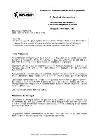 Le présent rapport a pour objet de proposer à la Commission Permanente de décider : - d’accorder une garantie d’emprunt sollicitée par l’association Home Protestant, - d’accorder une garantie d’emprunt sollicitée par l’association Bartischgut.
