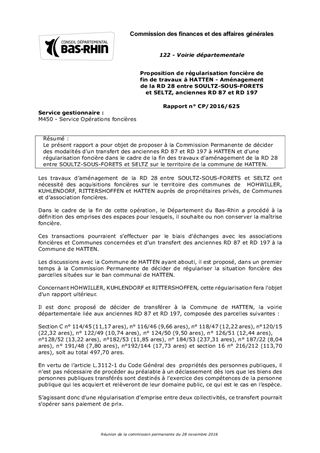 Le présent rapport a pour objet de proposer à la Commission Permanente de décider des modalités d'un transfert des anciennes RD 87 et RD 197 à HATTEN et d'une régularisation foncière dans le cadre de la fin des travaux d’aménagement de la RD 28 entre SOULTZ-SOUS-FORETS et SELTZ sur le territoire de la commune de HATTEN.