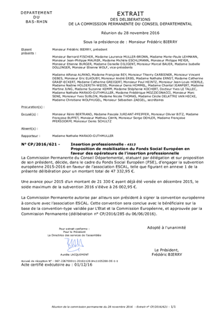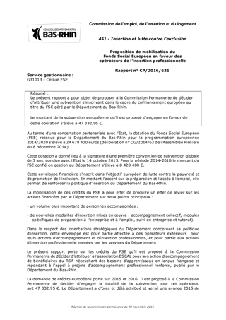 Le présent rapport a pour objet de proposer à la Commission Permanente de décider d’attribuer une subvention s’inscrivant dans le cadre du cofinancement européen au titre du FSE géré par le Département du Bas-Rhin. Le montant de la subvention européenne qu’il est proposé d'engager en faveur de cette opération s’élève à 47 332,95 €.