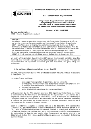 Le présent rapport a pour objet de proposer à la Commission Permanente de décider de la mise en œuvre d’un partenariat avec 3 centres d'interprétation du patrimoine (CIP) : Les Ateliers de la Seigneurie avec la Communauté de Communes de Barr-Bernstein, le château de Lichtenberg avec la Communauté de Communes du Pays de La Petite Pierre, la Maison Rurale de l'Outre-Forêt avec la Communauté de Communes de Sauer-Pechelbronn et l'association des Amis de la Maison Rurale de l'Outre-Forêt. Ce partenariat prendrait la forme de conventions d'objectifs pluriannuelles (2017-2019), à conclure entre le Département du Bas-Rhin et chacun des CIP.