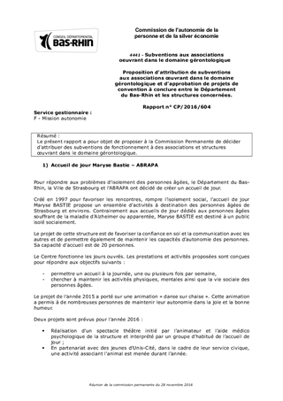 Le présent rapport a pour objet de proposer à la Commission Permanente de décider d'attribuer des subventions de fonctionnement à des associations et structures œuvrant dans le domaine gérontologique.
