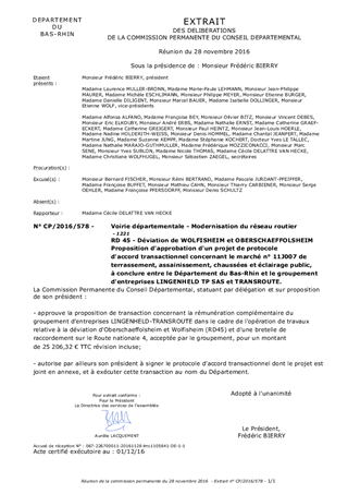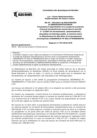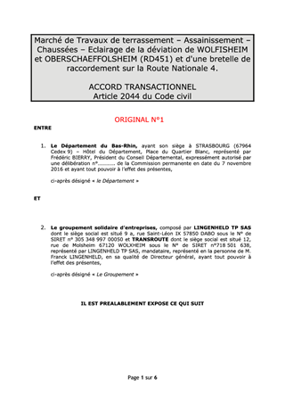 RD 45 - Déviation de WOLFISHEIM et OBERSCHAEFFOLSHEIM Proposition d'approbation d'un projet de protocole d'accord transactionnel concernant le marché n° 11J007 de terrassement, assainissement, chaussées et éclairage public, à conclure entre le Département du Bas-Rhin et le groupement d'entreprises LINGENHELD TP SAS et TRANSROUTE.