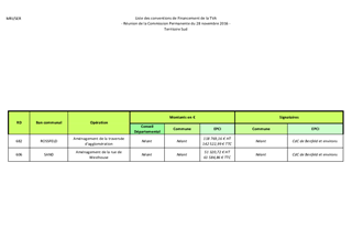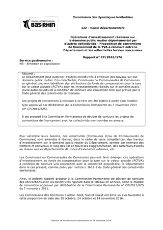 Le Département peut autoriser d’autres collectivités à effectuer des travaux sur son domaine public routier. Ces collectivités, Communes ou Communautés de Communes en général, peuvent bénéficier des attributions du fonds de compensation pour la taxe sur la valeur ajoutée (FCTVA) pour les investissements réalisés sur le domaine public d’une autre collectivité à condition de conclure une convention telle que prévue par le Code général des collectivités territoriales. Les projets de conventions à conclure à ce titre ont été établis à partir d’un modèle-type approuvé par délibération de la Commission Permanente du 7 novembre 2011 (n° CP/2011/825). Il est proposé à la Commission Permanente de décider de conclure les projets de conventions de financement avec les collectivités mentionnées en annexe.