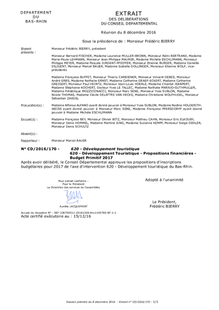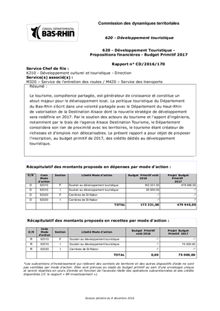 Le tourisme, compétence partagée, est générateur de croissance et constitue un atout majeur pour le développement local. La politique touristique du Département du Bas-Rhin s’écrit dans une volonté partagée avec le Département du Haut-Rhin de valorisation de la Destination Alsace dont la nouvelle stratégie de développement sera redéfinie en 2017. Par le soutien des acteurs du tourisme et l’apport d’ingénierie, notamment par le biais de l’agence Alsace Destination Tourisme, le Département consolidera son lien de proximité avec les territoires, le tourisme étant créateur de richesses et d’emplois non délocalisables. Le présent rapport a pour objet de proposer l'inscription, au budget primitif de 2017, des crédits dédiés au développement touristique.